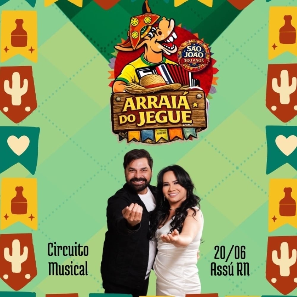 O Arraia do Jegue é o evento mais tradicional do São João de Assú quando a referência é Forró de Verdade,alegria e organização. Este ano , o Jegue completa 27 anos e será realizado no dia 20 de junho tendo como atração a banda Circuito Musical. São 3KM de Forró atrás do trio numa.viagem no tempo e na cultura junina. Se você busca Forró , o evento é esse aqui