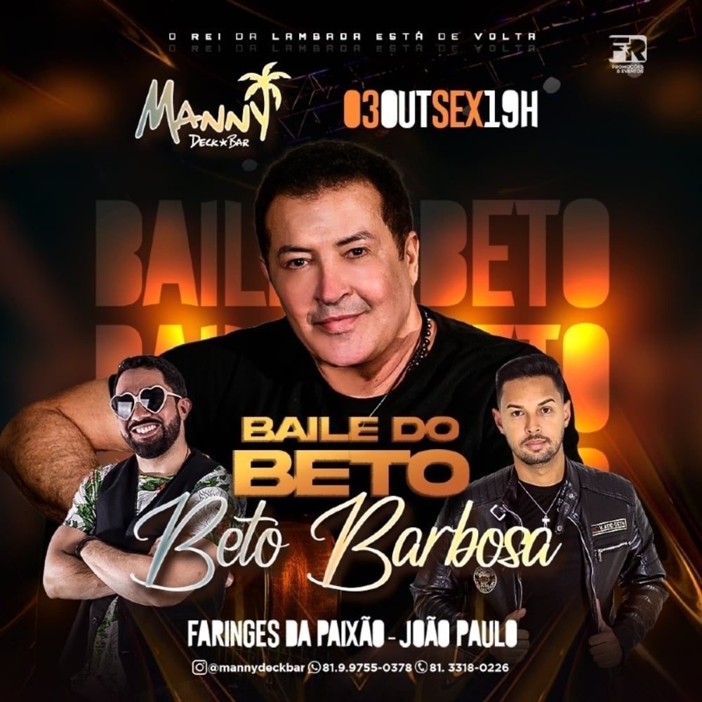 “Adocica meu amor, adocica!” 💃 O Rei da lambada está de voltaa! BETO BARBOSA, ele bem de pertinho, num show exclusivo! no Manny Deck. Sexta 03 de Outubro, a partir das 19h tem o BAILE DO BETO 👏