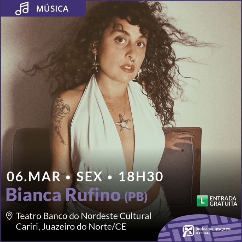 Bianca Rufino é poeta, cantora, compositora e performer paraibana. Sua obra, marcada pela coragem e pela presença, atravessa música, poesia, performance e artes visuais, criando experiências de transformação pessoal e coletiva. Em uma apresentação intimista, Bianca costura canções autorais, poemas e ações performáticas. Entre voz, violão e corpo, a artista constrói um território de encontro entre música e palavra, abrindo um espaço de presença, experimento e atravessamento.