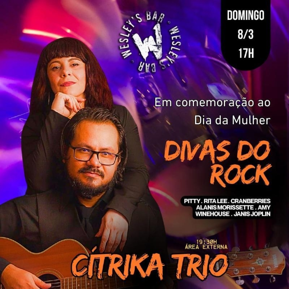 e teremos um show super especial da banda CÍTRICA fazendo o ESPECIAL DIVAS DO ROCK, no repertório... Pitty, Rita Lee, Cranberries, Alanis Morissette, Amy Winehouse, Janis Joplin....