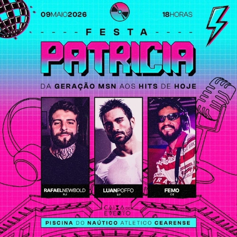 A Festa Patrícia conecta gerações! Dos hits nostálgicos da geração MSN aos sucessos de hoje, embarque em uma viagem sonora dos anos 2000 até os mais atuais. Vai ter de tudo: funk, pop, e muito mais, tanto brasileiro quanto internacional. Dia 9 de maio, das 18h às 2h da manhã, na icônica piscina do Náutico Atlético Cearense. DJs locais e nacionais garantem a vibe perfeita. Garanta seu ingresso e venha fazer história!