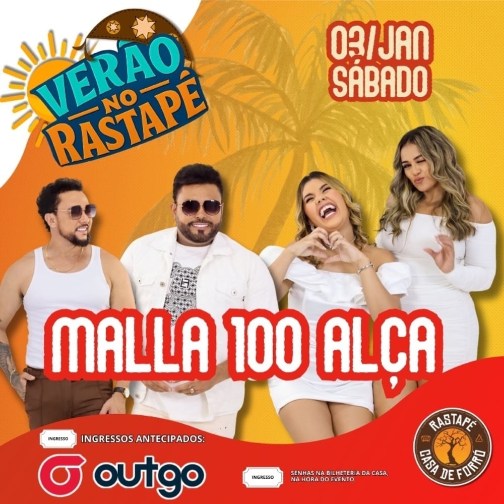Verão em Natal você já sabe como é: de dia é praia e de noite é Rastapé! SÁBADO (03/01) Michele Ribeiro e Forró Vem Xamegar MALLA 100 ALÇA OBS: após encerrada a venda antecipada, retomaremos as vendas na bilheteria da casa na hora do evento. 22h às 04h.