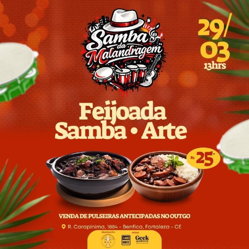 Na ocasião, ENTRADA É GRATUITA, com acesso à nossa programação, artistas e stands. No entanto, haverá a venda da PULSEIRA DA FEIJOADA no valor de R$ 25, que dará direito à 01 prato da nossa deliciosa feijoada. 💃🏻