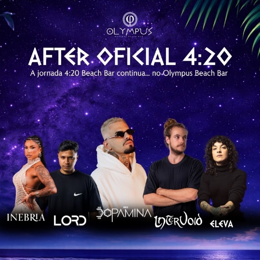 Depois do 4:20 Beach Bar, o som e a energia seguem noite adentro no Olympus Beach Bar. Prepare-se para um after intenso, com música, vibração e uma pista que vai até o amanhecer.