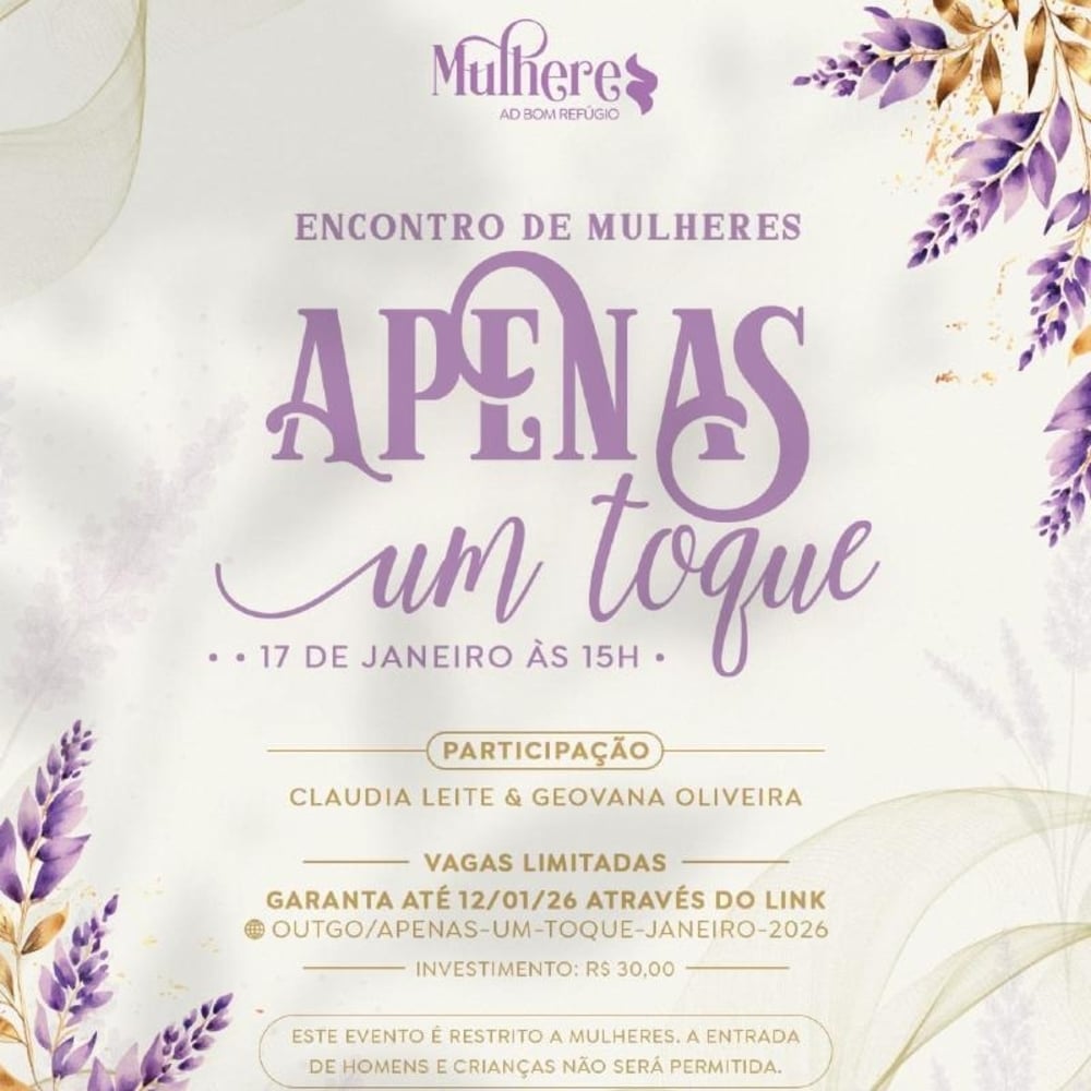 O encontro de Mulheres Apenas Um Toque é um evento exclusivo para Mulheres que têm sede e fome da presença de Deus. Organizado pelas Mulheres Bom Refúgio.