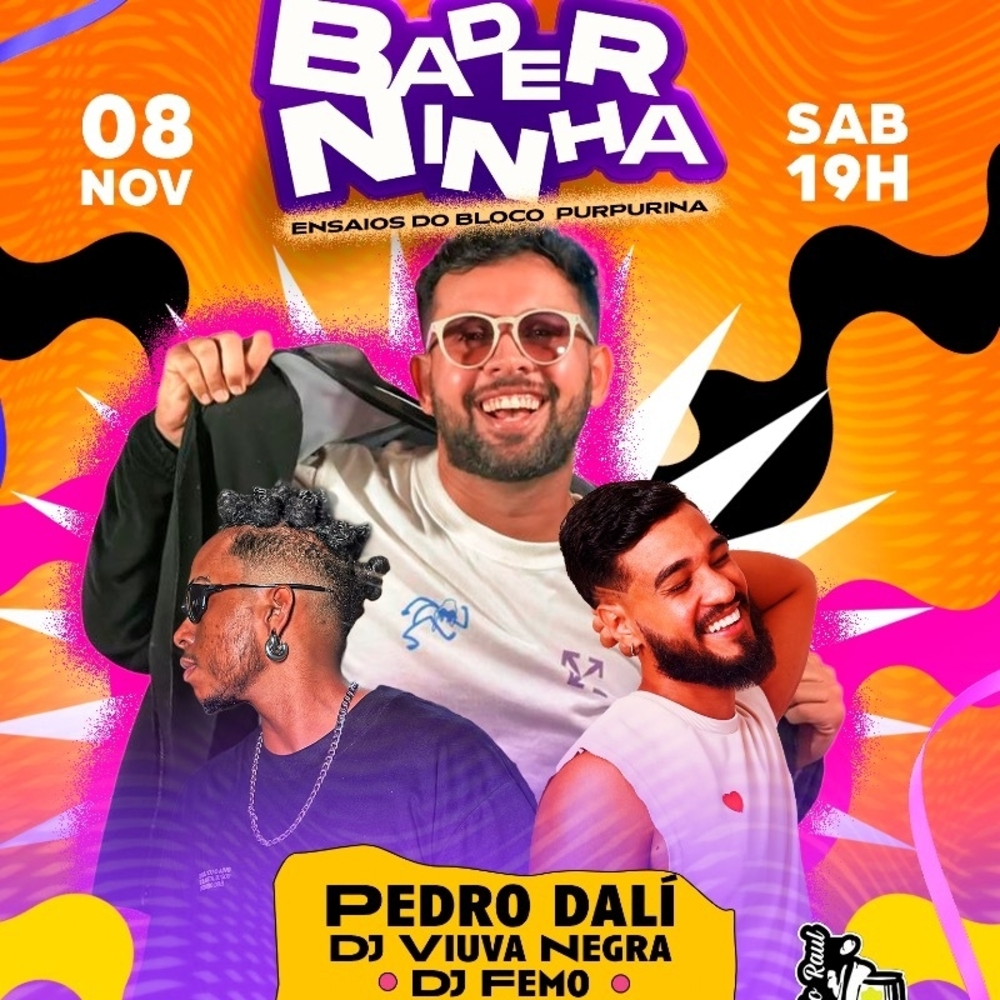🎉 Sábado (08/11) – BaderNinha com Pedro Dalí, Viúva Negra e Femo. A regra é simples: se for pra bagunçar, que seja pra sustentar até o final!