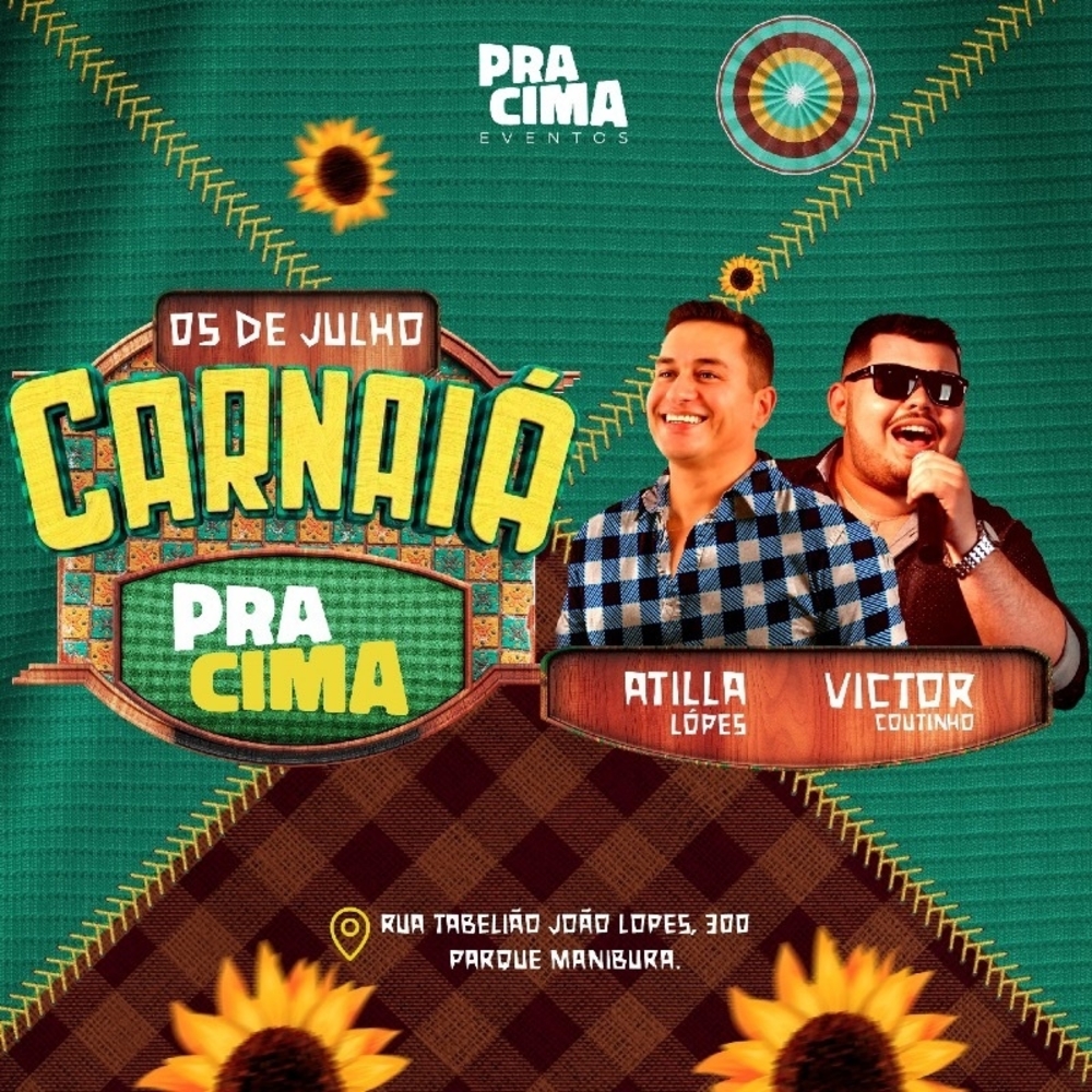 O evento "*Carnaiá Pra Cima*", promovido pela Pra Cima Eventos, será realizado no dia 5 de julho de 2025, a partir das 16h, na Rua Tabelião João Lopes, 300, no bairro Parque Manibura, em Fortaleza, Ceará.