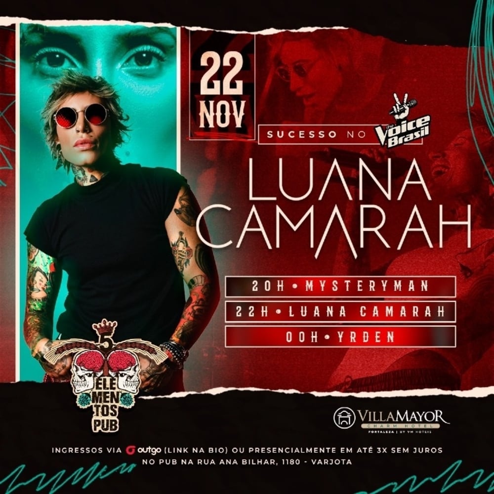 No dia 22/11, o Pub 5 Elementos recebe a potência e o carisma de Luana Camarah, voz marcante que brilhou no palco do The Voice Brasil e segue fazendo história no rock nacional.
