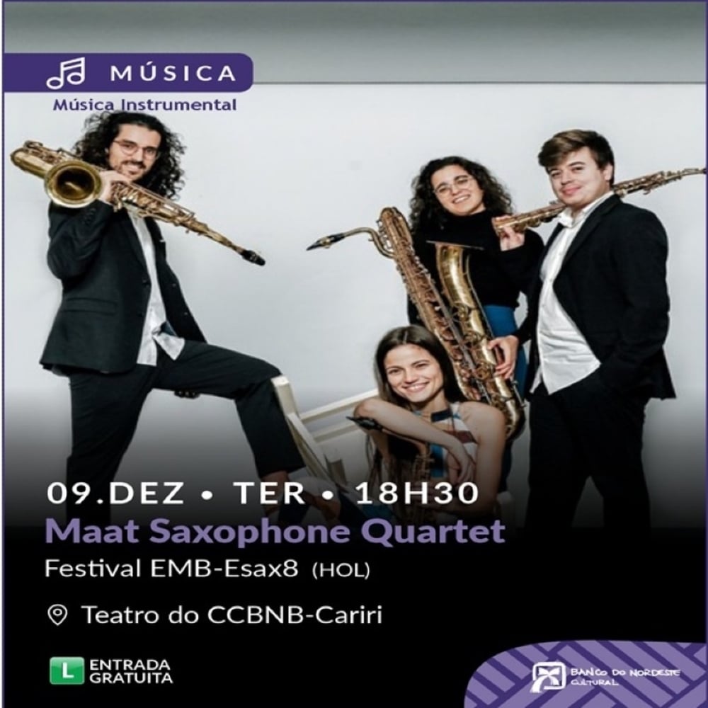 O premiado Maat Saxophone Quartet, formado em 2018 no Conservatorium van Amsterdam, é conhecido por seu repertório de alto nível, tendo vencido o Prémio Jovens Músicos (2018) e o Dutch Classical Talent Award (2022). O grupo lançou os álbuns "Ciudades" (2020) e "Renascer" (2023), este último misturando Fado e música contemporânea, além de estrear a produção "No one is too small" (2024), que também deu nome ao seu terceiro álbum. O grupo realizará uma turnê pelo Brasil, fazendo passagem pelo Cariri nas atividades do festival de Encontro de Músicos de Banda (EMB).