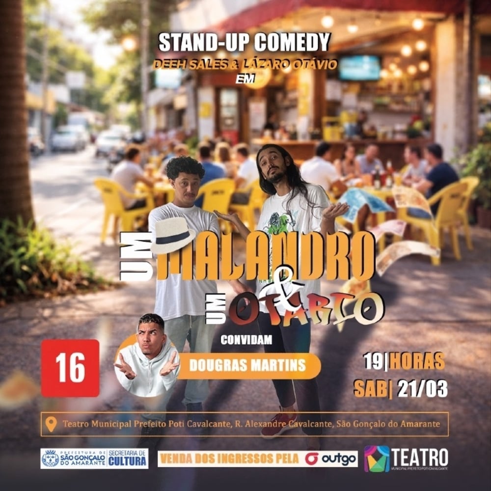 Os humoristas Deeh Sales e Lázaro Otávio estreiam seu novo espetáculo Um malandro e um otário no Teatro Municipal Prefeito Poti Cavalcante. Um espetáculo repleto de histórias engraçadas, momentos de otarices e malandragens e com um convidado mais que especial *Dougras Martins. Garante já o seu ingresso e corre pra se divertir muito.
